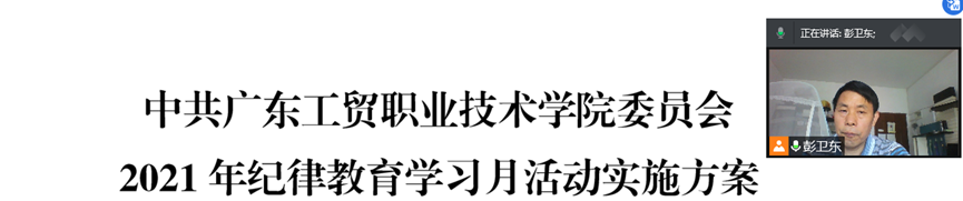 彭卫东首先作了2021年纪律教育月活动动员:传达了学校党委部署的2021年纪律教育月活动的方案。其次重点强调了2021年纪律教育月活动的意义:“学党史悟思想,守纪律铸忠诚”,明明白白做人、干干净净做事,遵守党纪党规,增强 “四个意识”、坚定 “四个自信”、做到 “两个维护”;再次明确了纪律教育月活动的学习内容:习近平总书记关于党的历史、全面从严治党、作风建设和纪律建设的重要论述;最后,彭卫东书记要求大家静下心来认真学习,要学原文、读原著、悟原理,要理论联系实际,将学习成果转化为工作成绩。
