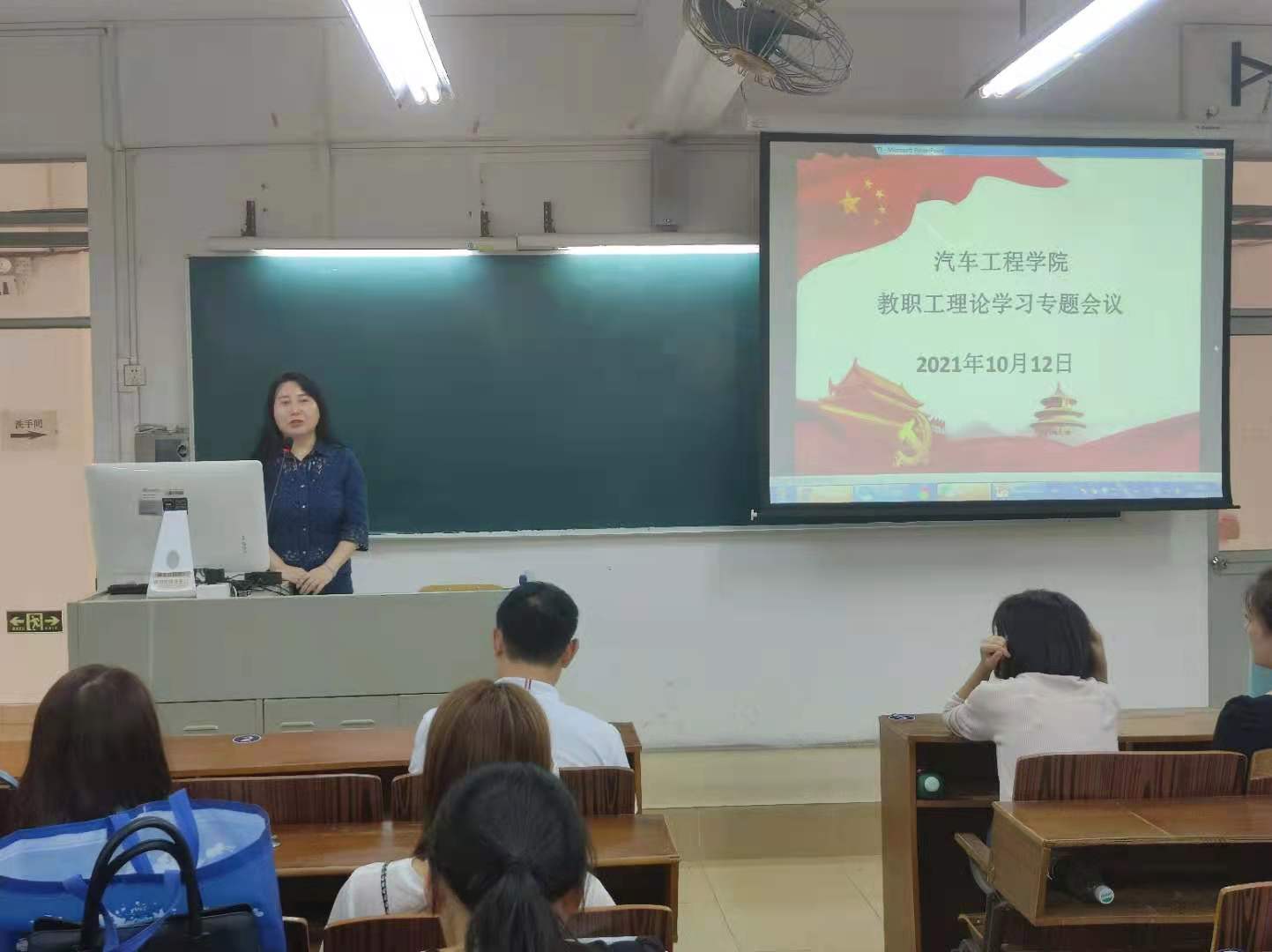 根据学校《关于组织开展教职工理论学习的通知》文件精神,10月12日下午,汽车工程学院党总支组织全体教职工开展专题政治学习。为方便学院教职员工,遵从“以师为本”的原则,体现学院文人关怀,本次专题政治学习活动根据学院实际情况开设了天河校区西区综合楼405和白云校区行知楼303两个会场。