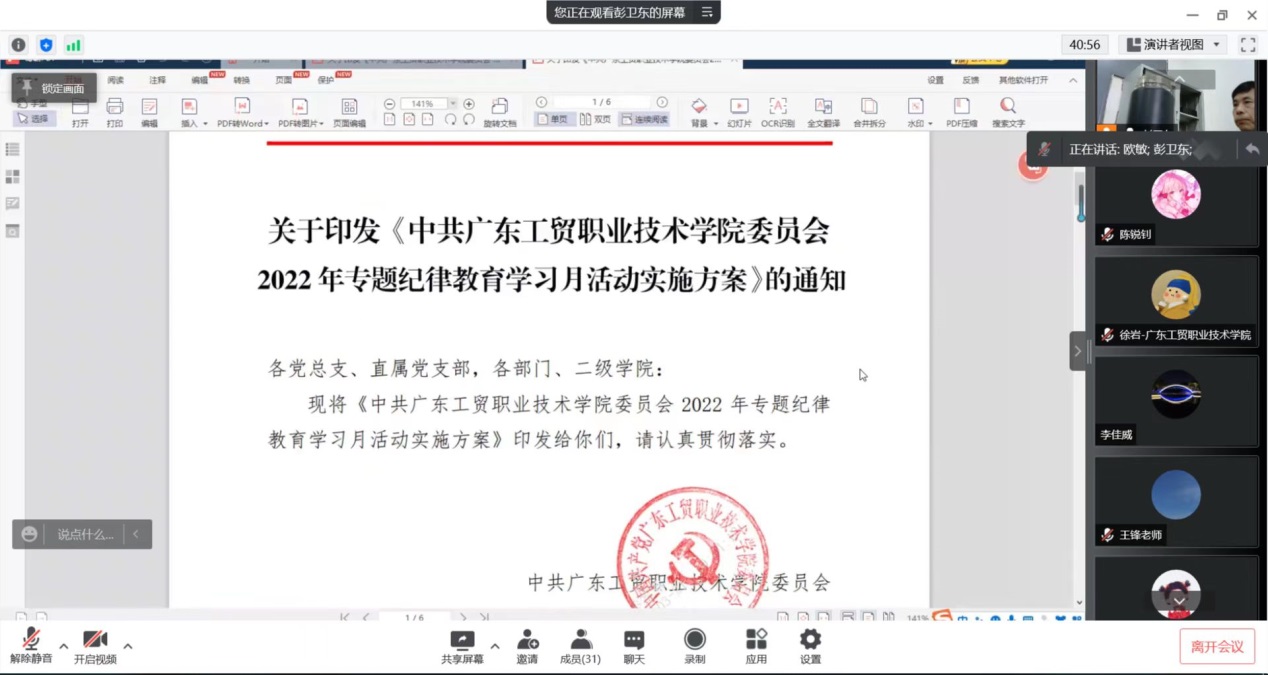 会上,党总支副书记欧敏带领全体教职工共同学习了《关于印发<中共365英国上市官网在线委员会2022年专题纪律教育学习月活动实施方案>的通知》(粤工贸院党字〔2022〕14号)文件精神,指出本次活动以“守纪律强作风,促整改提实效”为主题,以党员领导干部为重点,面向全体党员干部开展教育,强调教师要自觉遵守学校的各项规章制度,强化党章党规党纪意识,锤炼实干担当廉洁政治品格,以实际行动推进巡察整改任务高质量完成,为学校持续健康稳定发展提供坚强纪律保障。