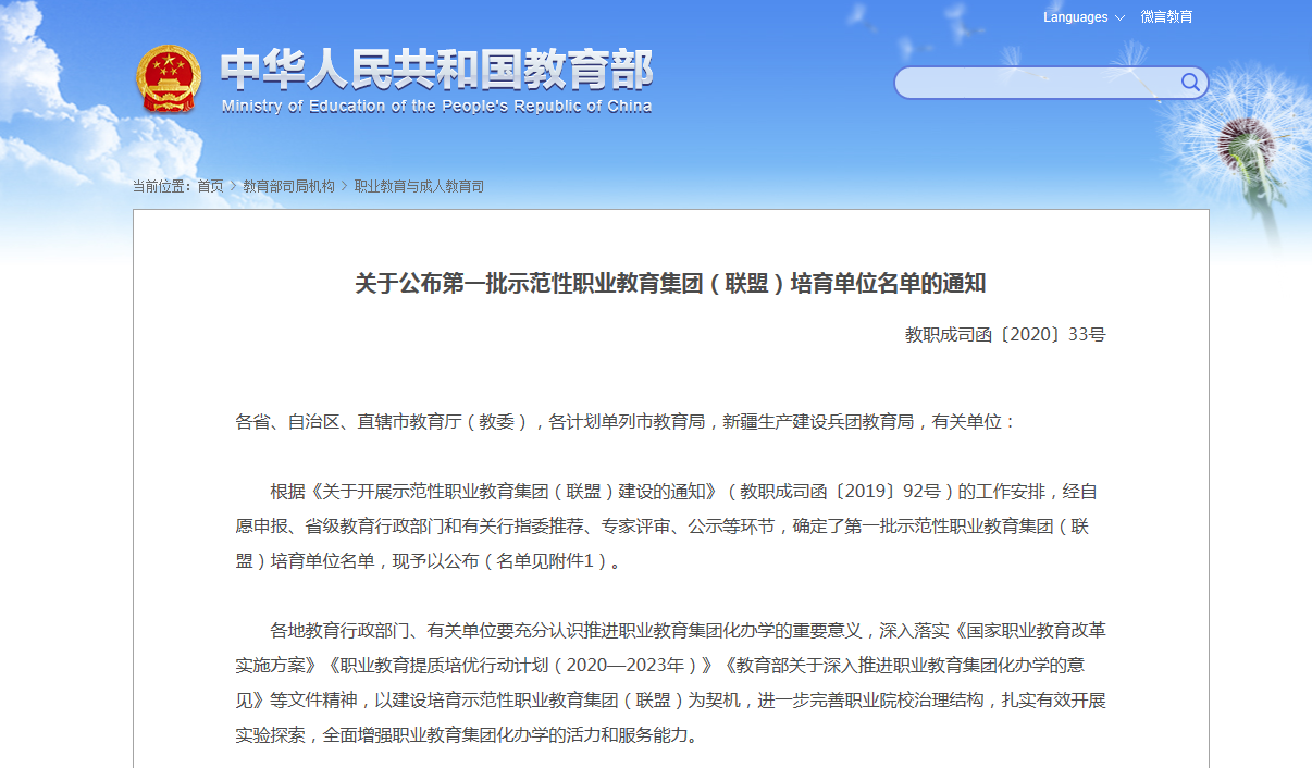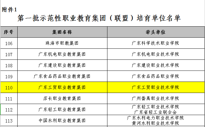 10月15日,教育部发布了《关于公布第一批示范性职业教育集团(联盟)培育单位名单的通知》(教职成司函[2020]33号),由365官网牵头的广东工贸职业教育集团成功入选。