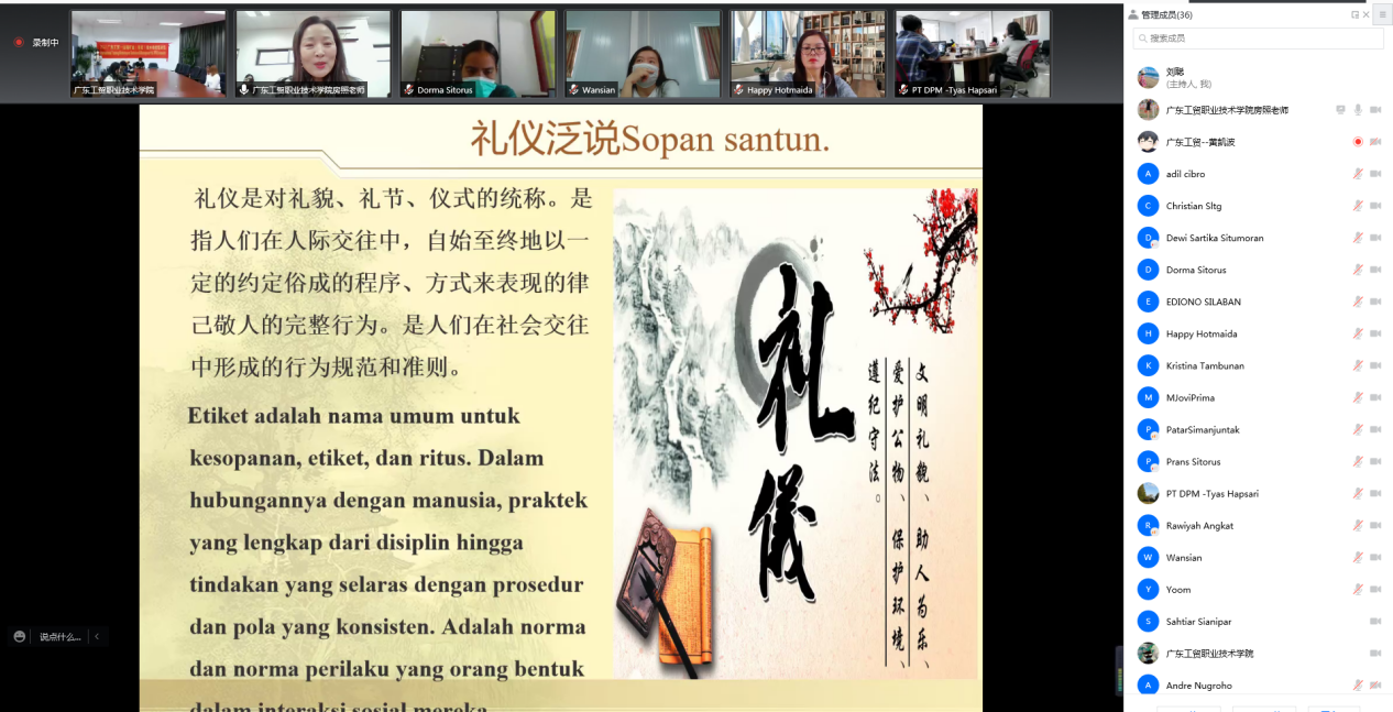 此外,此次培训因疫情缘故采用线上形式进行,培训班充分考虑线上教学的特点,在课程设置和教学方式方面作了针对性安排,技术项目管理等理论指导和技能实操演示相结合,听课与研讨互动相结合,技术技能培训与传统文化交流相结合,增强了培训的生动性和灵活性。同时,此次选拔学校优秀印尼籍留学生担当实时翻译,效果良好,确保了培训的准确性和流畅性。