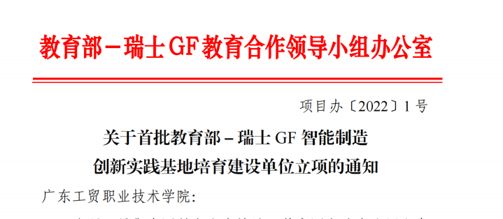 为深入贯彻全国教育大会精神,落实国务院办公厅印发《关于深化产教融合的若干意见》,根据《关于与瑞士联邦乔治费歇尔集团公司在智能制造领域开展应用型和技术技能型人才培养合作的通知》(教外司欧[2021]610号)工作安排,学校经申报、省级主管部门和有关行业企业推荐、专家遴选、网上公示等环节,正式立项成为首批教育部—瑞士GF智能制造创新实践基地培育建设单位。