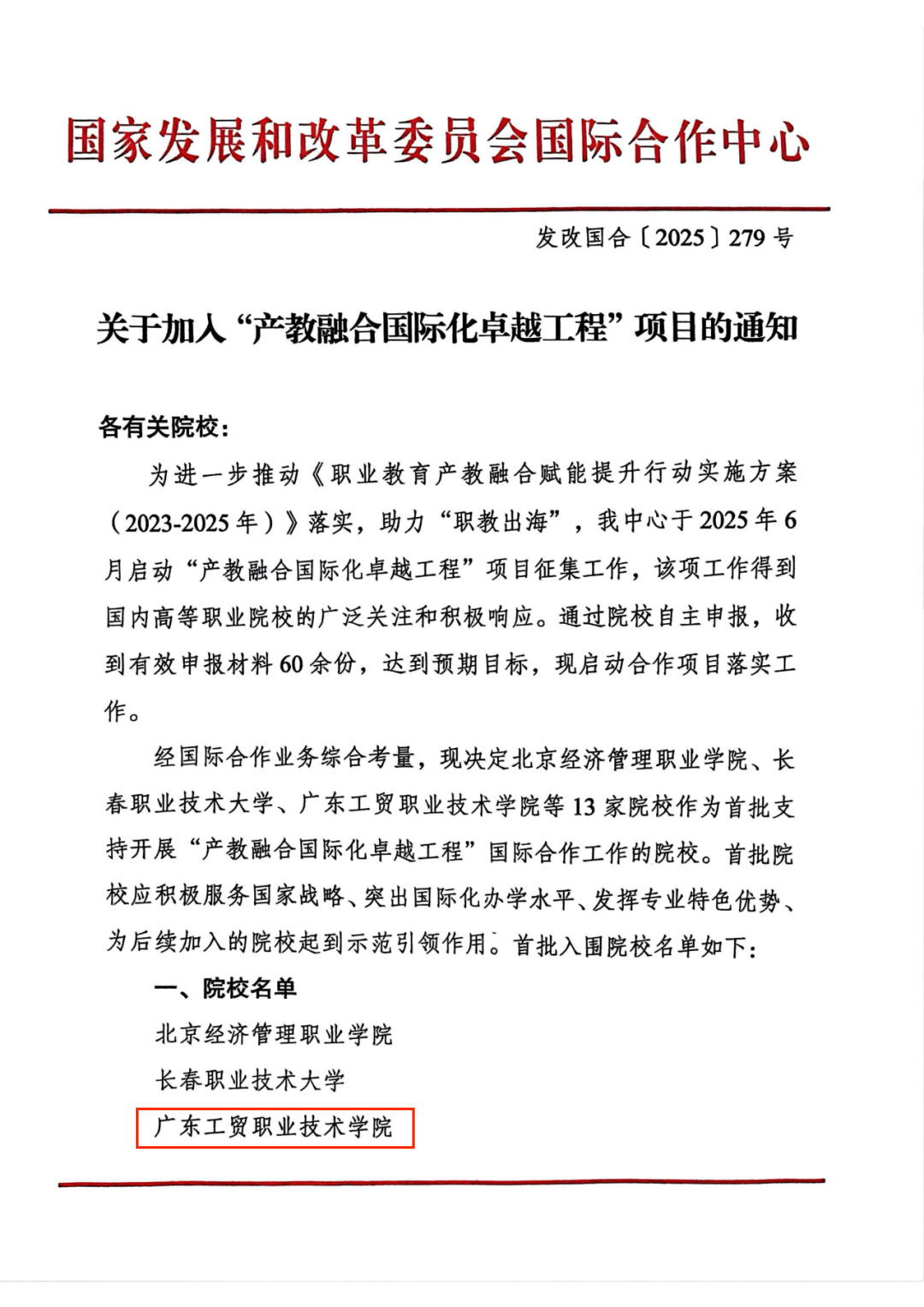 近日,365英国上市官网在线成功入选国家发展和改革委员会国际合作中心“产教融合国际化卓越工程”项目首批支持院校名单。