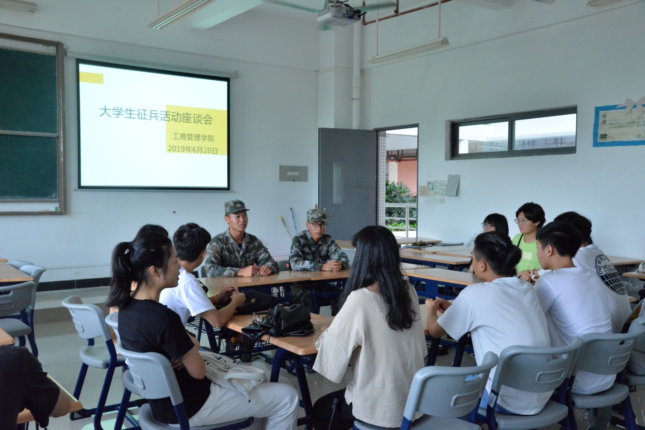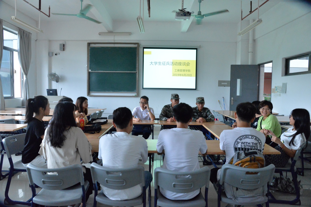 2019年6月20日,工商管理学院在白云校区明德楼1-412举行大学生征兵工作座谈会。此次座谈会举办旨在宣传我国征兵活动,鼓励大学生进入军队,体验军旅生活,为我国国防力量贡献力量。工商管理学院党总支谢宏祥副书记、辅导员罗福周、退伍士兵以及各班级13名学生代表参加座谈会。