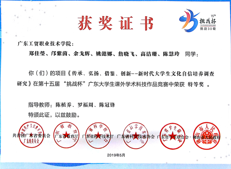 在学校相关部门和领导的大力支持和帮助下,经过不断地挑灯夜战修改报告,不断的模拟演练作品答辩,我们带着修改完善的作品自信地参加了广东省第十五届挑战杯比赛,并且最终获得了最高奖项特等奖,并被推荐参加全国第十六届挑战杯,获得国赛三等奖,开创365官网在挑战杯竞赛上的历史。