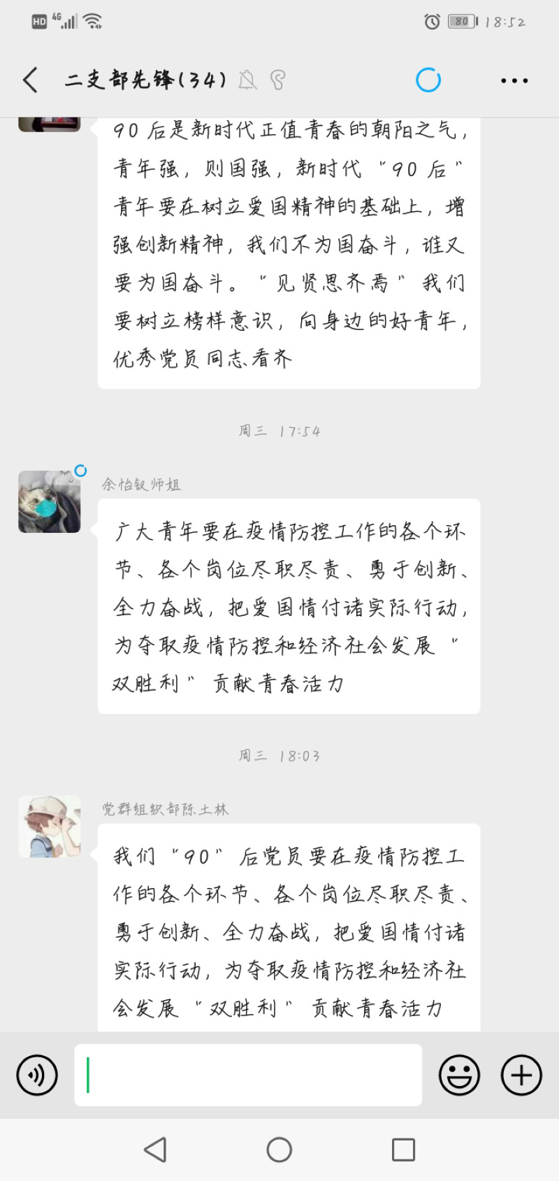 为深入学习贯彻习近平新时代中国特色社会主义思想和系列重要讲话精神,工商管理学院学生第二党支部全体党员于2020年3月18日通过网络形式学习《习近平总书记给北京大学援鄂医疗队“90”后党员的回信》,进一步体会共产党员的责任与义务。