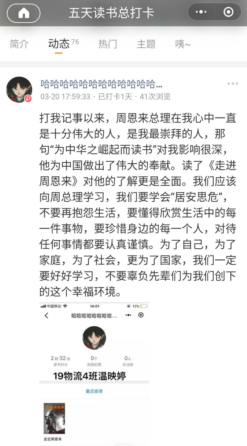 这次特殊的读书会,不仅激发了同学们读书的热情,也让同学们对于中华优秀文化有了更加深刻的理解。我们坚信没有一个冬天不可逾越;和煦的春风正吹开冰封的湖面,唤醒中华大地上又一年的勃勃生机。工贸的春花正在悄然开放,它呼唤着寻真求是、格物致知的工贸学子们奋勇向前,以积极向上的风貌去拥抱时代赋予青年人的无限可能。