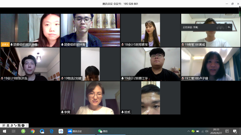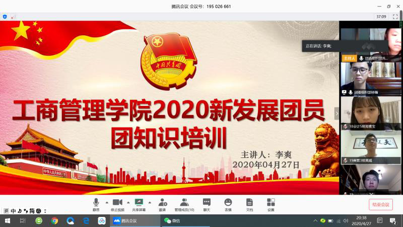 为深入贯彻落实习近平新时代中国特色社会主义思想,扎实推进工商管理学院团员发展和教育工作,充分发挥团组织的教育职能,把培养教育青年一代团员的任务落到实处,培育有理想、有文化、有道德、有纪律的社会主义事业接班人,使我院共青团组织更好成为团结教育全院青年团员的坚强核心。2020427日晚,工商管理学院针对本学期拟发展团员开展了视频团课,主讲人为团委书记李爽,组织部部长冼静雅,副部长钟瀚以及全体拟发展团员参加了本次学习活动。
