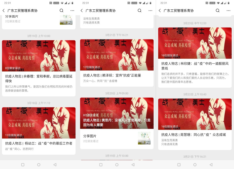 虽然我们可能无法成为战役的英雄,但我们会用不同的方式为所有奋战在疫情一线的工作人员致以最诚挚的敬意。为此,2020年3月12日-3月30日,我院举办了“致敬最美逆行者”线上征集活动。活动推出,共收到6份投稿作品,在此基础上,我院推出了6篇抗疫人物志推文。不仅如此,同学们还积极地参与志愿活动和抗疫工作,展现新时代大学生勇于担当,甘于奉献的模范精神,发扬爱党爱国、勇当英雄、甘愿奉献的良好风尚。以身作则带动周围的人们共同调整心态,积极面对疫情,相信黑暗终将过去。