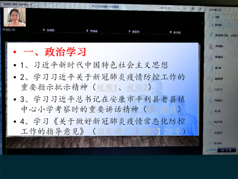 会上,周清莲首先带领全体教职工进行了政治学习,学习内容包括习近平新时代中国特色社会主义思想,习近平关于新冠肺炎疫情防控工作的重要指示批示精神,习近平总书记在安康市平利县老县镇中心小学考察时的重要讲话精神,以及《关于做好新冠肺炎疫情常态化防控工作的指导意见》等。她强调,疫情防控期间,全体教职工要充分利用“学习强国”学习平台、网络直播平台、微信公众平台等积极进行政治学习,提高政治站位,着力形成打赢疫情防控阻击战的强大合力。