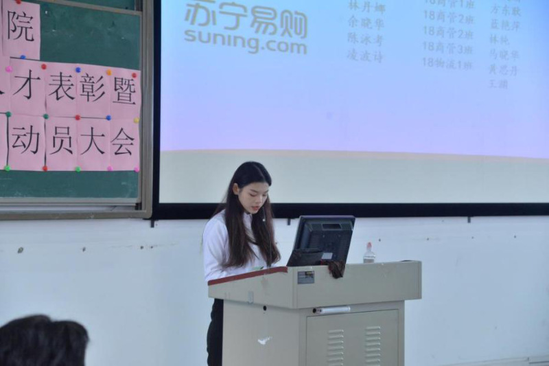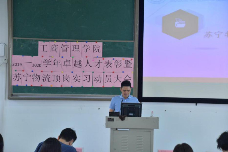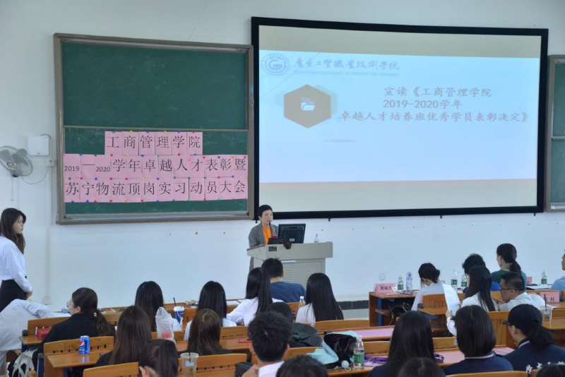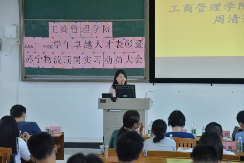 2020年10月27日下午,工商管理学院在明德楼2-305召开了2019-2020学年卓越人才表彰暨苏宁物流顶岗实习动员大会。工商管理学院党总支书记周清莲、副书记谢宏祥、副院长倪春丽、专任教师、辅导员及18、19级商管专业180多名学生共同参加了会议。
