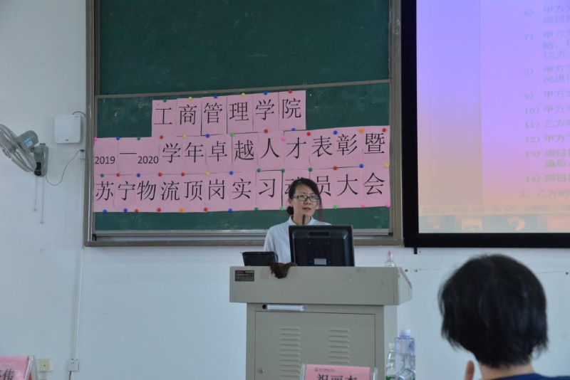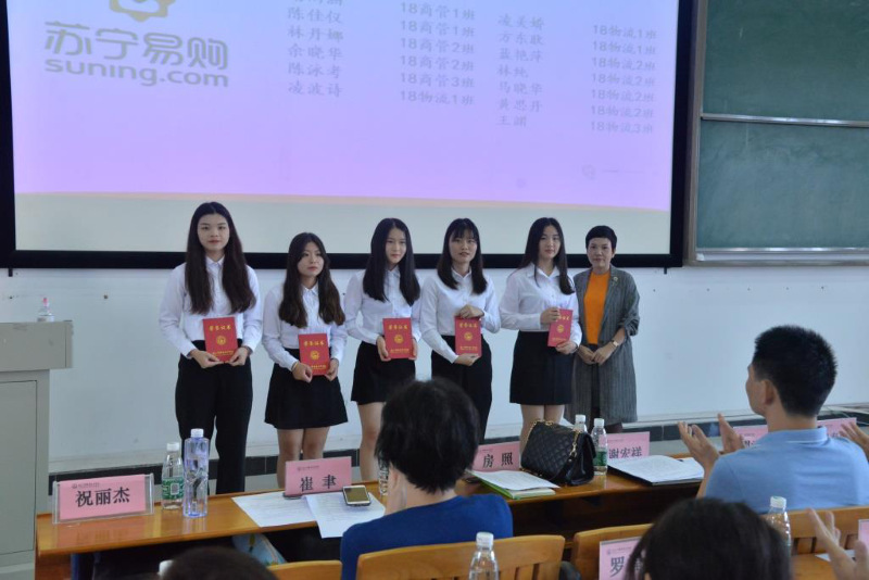 会上,首先进行颁奖仪式,倪春丽、谢宏祥分别宣读了2019-2020卓越人才培养班优秀学员和2019-2020苏宁物流“优秀专项顶岗实习生”的表彰决定,并进行了颁奖。