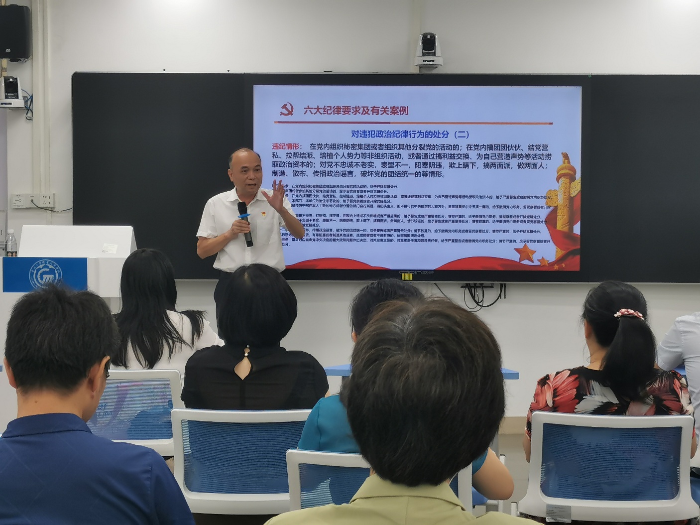 9月6日下午,工商管理学院党总支在天河校区综合楼205组织开展纪律教育月专题学习,工商管理学院党总支书记周清莲主持,学院班子成员和全体教师党员参加。本次学习邀请了学校党委副书记、纪委书记夏韩辉主讲,带领大家学习《中国共产党纪律处分条例》。