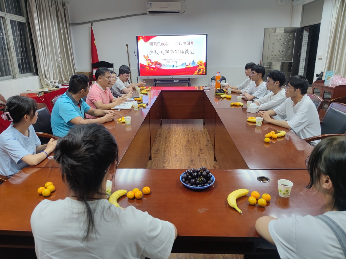 为了庆祝祖国73岁生日,体现对少数民族学生的关心关爱,激发少数民族学生的爱国爱校热情,促进和帮助少数民族学生成长成才,计算机学院学生第一党支部于10月1日晚上在东区教学楼104会议室开展少数民族学生座谈会,计算机学院党总支书记张宁和学工办主任代启兵出席了会议,会议由支部书记古民华主持