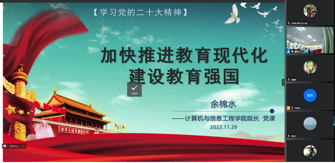 11月29日下午,计算机与信息工程学院组织全体教职工在教学楼104开展了学习党的二十大精神宣讲,由院长余棉水主讲,代启兵老师主持,因疫情原因,会议由线上线下结合的形式进行。