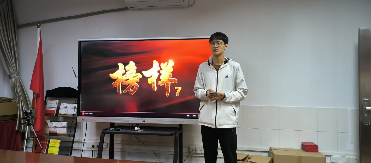 学生第二党支部的邝志强同学发表观看感悟。他表示从榜样王亚平和路生梅的事例中学习到应时刻以榜样标准,在思想上以服务群众为宗旨,以党中央为核心,拥护中国共产党的领导,做新时代的有志青年、有担当的青年。