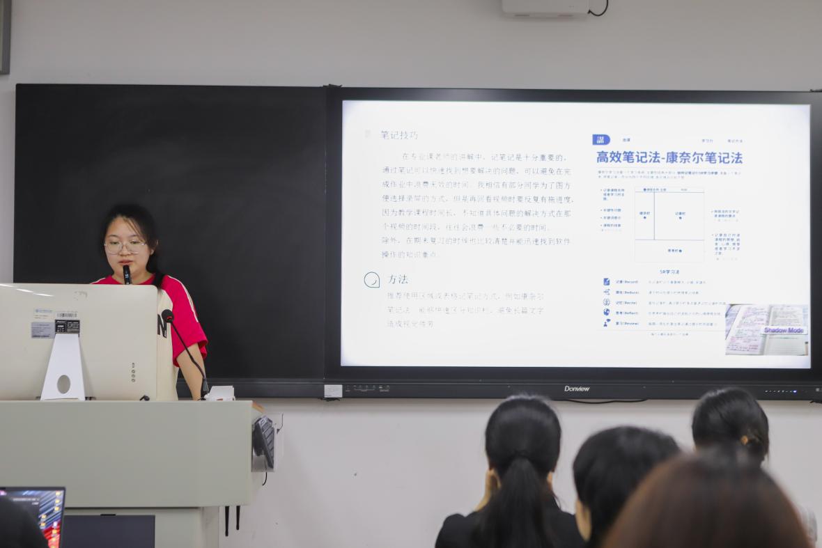 紧接着,22级数媒专业的朋辈导生黄小淳同学为大家做了学习经验交流分享。她从制定计划与目标,学习笔记记录方法,专业学习方法等方面与在场的学生进行了交流。黄小淳通过本次的经验分享为暂时学习落后的同学们提供了借鉴和帮助,也赢得了全体同学的一致认可。