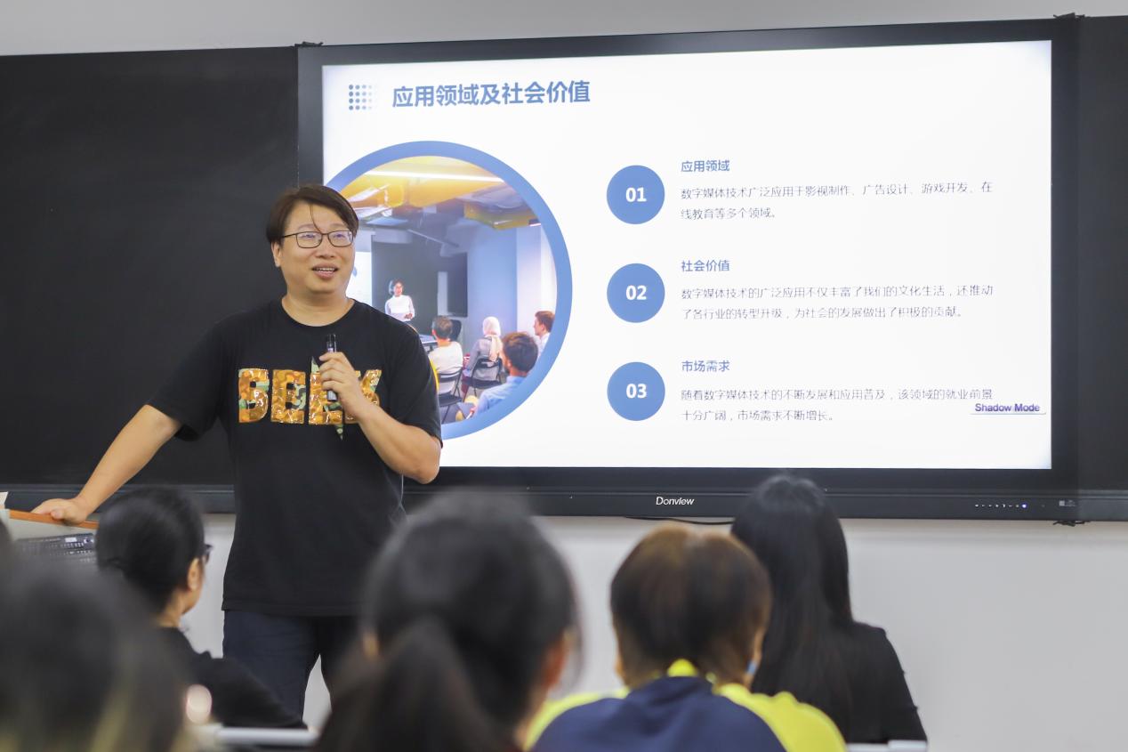 活动伊始,数字媒体学科带头人周宇副教授围绕专业应用领域、实践技能提升途径、市场价值以及需求等方面开展了“探索技术与创意的无限可能”的专题演讲。以轻松幽默的方式为大家解读了数字媒体的前景,让同学们对数字媒体专业有了更深层次的认识,大大激发了大家的学习动力。