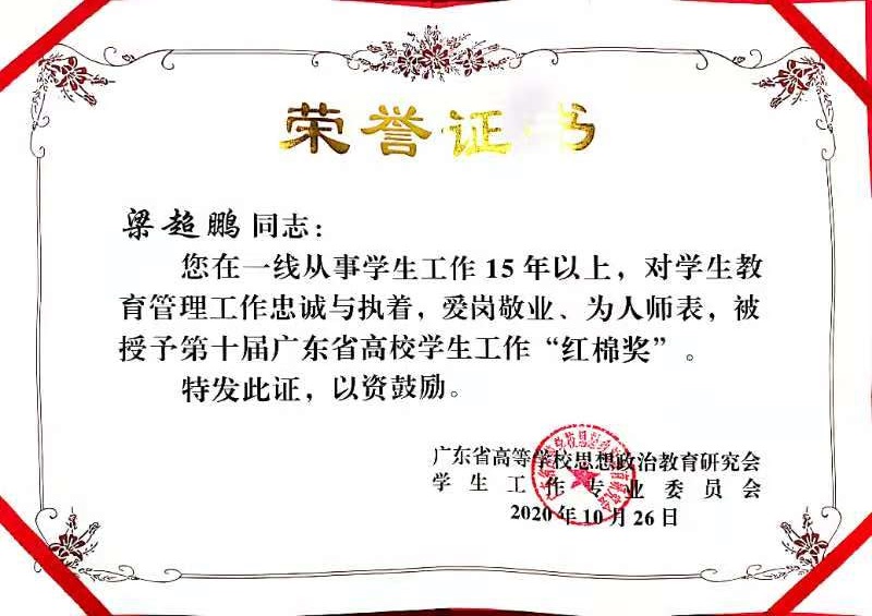 梁超鹏荣获第十届广东省高校学生工作“红棉奖”