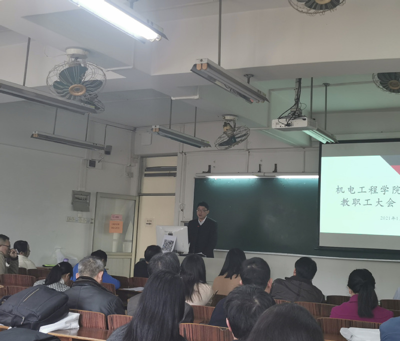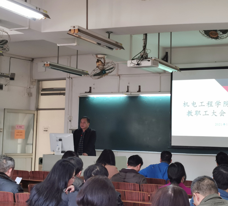 2021年1月12日,机电工程学院在天河校区综合楼407召开全院教职工会议,会议就《机电工程学院事业编制聘用人员岗位奖励性绩效工资分配办法》内容展开。党总支书记邵超城、院长徐勇军等学院领导班子成员及全院教职工参加了会议,会议由党总支书记邵超城主持。