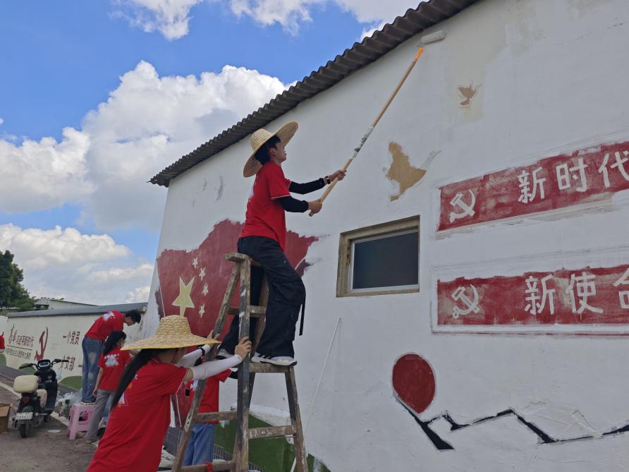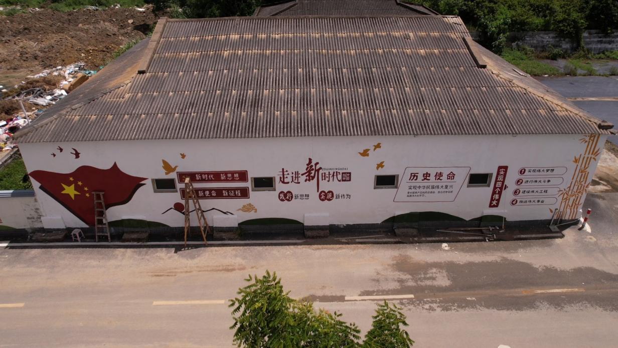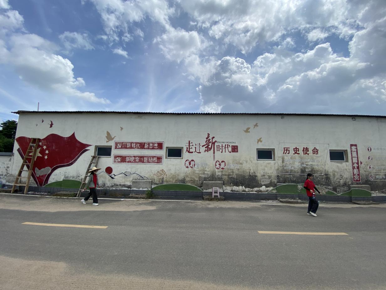 在南溪村,红星突击队以艺术之名,为乡村规划建设添加新彩。本次墙绘工作分两个部分:一是对旧墙进行维护修缮,二是对新墙进行创意绘制。清晨五点,当第一缕阳光尚未穿透薄雾,红星突击队带着对乡村的热爱与憧憬,整装待发,踏上了为南溪村添彩的旅程。抵达墙绘现场后,红星突击队立马进入工作状态,开始了墙面修缮工作和绘制工作。他们每天早上连续奋战近五个小时,汗水浸湿了衣背,却无一人言退。天有不测风云,偶尔几场突如其来的阵雨也给正在进行的工作带来不小的挑战,雨水不仅打湿了未干的底漆,也增加了工作的难度,但突击队的队员们并没有因此退缩,等待雨后天空逐渐放晴,红星突击队迅速调整状态回到墙绘现场。夕阳的余晖与不同颜料的光泽交相辉映,为南溪村的傍晚增添了一抹别样的光彩。