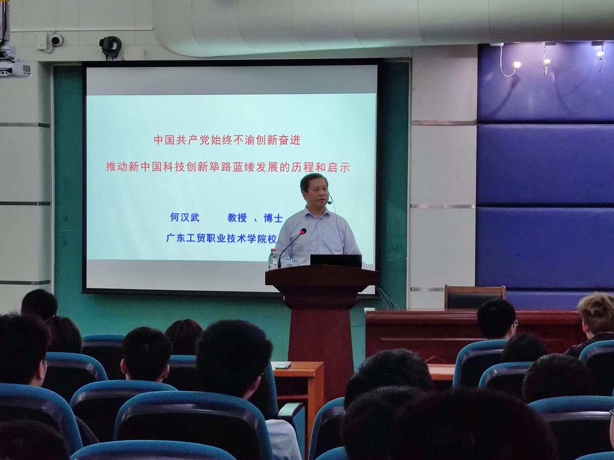 何汉武从“中国共产党创新奋进历史”、“新中国科技发展历程”、“新中国科技发展启示”、“青年勇担科技强国重任,引领科技创新时代”四个层面进行了深入浅出地讲解。
